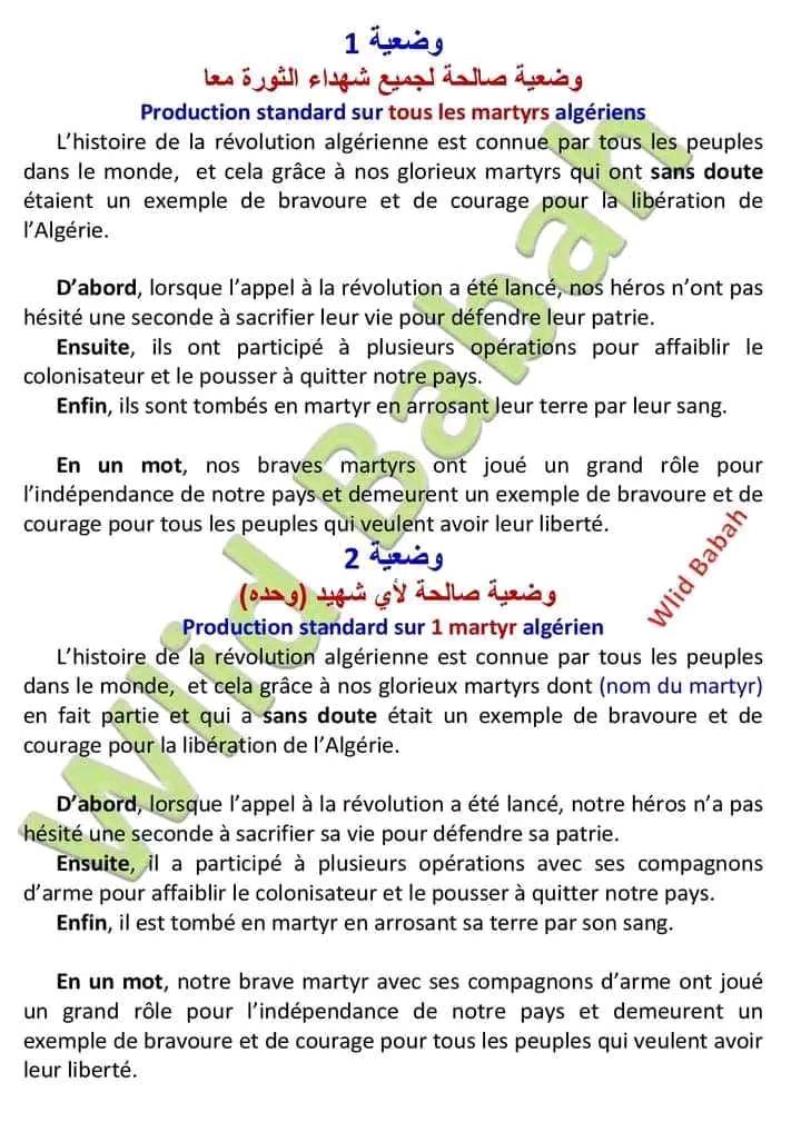 Comment rédiger une production écrite standard portant sur un martyr algérien.