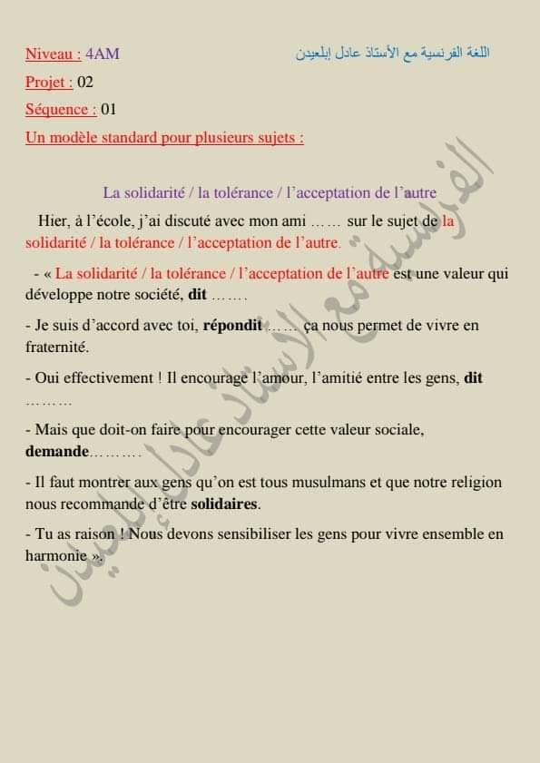 #السنة_الرابعة_متوسط : وضعية ادماجية خاصة بالمقطع الرابع يمكن استعمالها للمواضيع التالية : التضامن / التسامح / تقبل الآخر .
